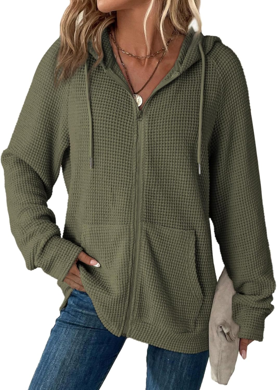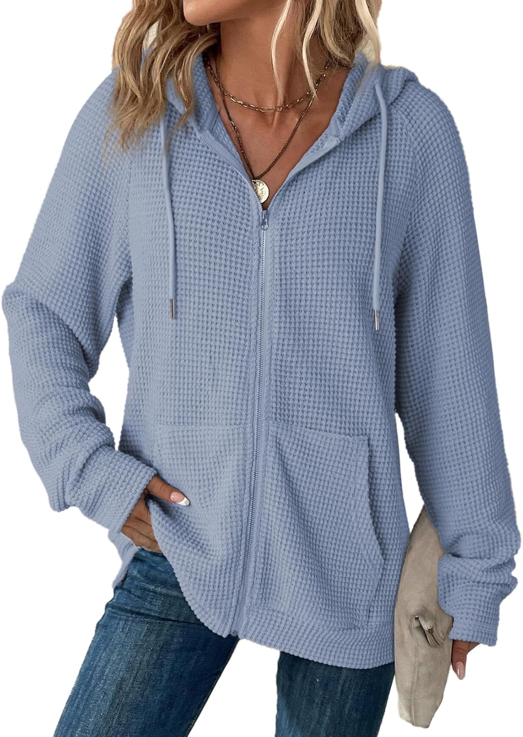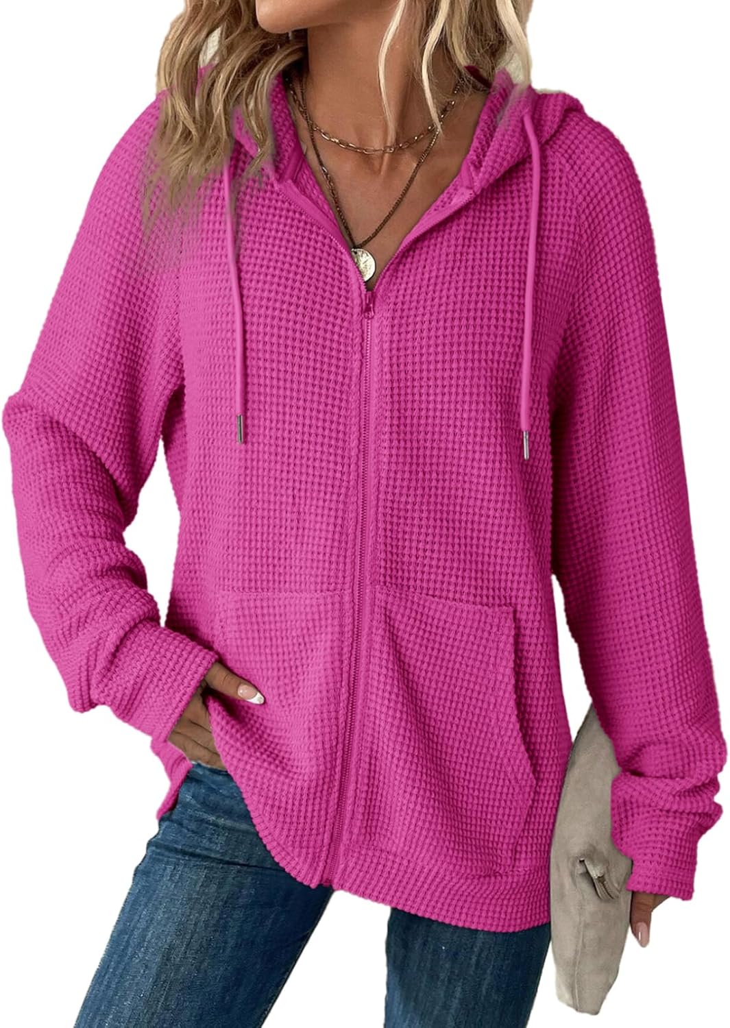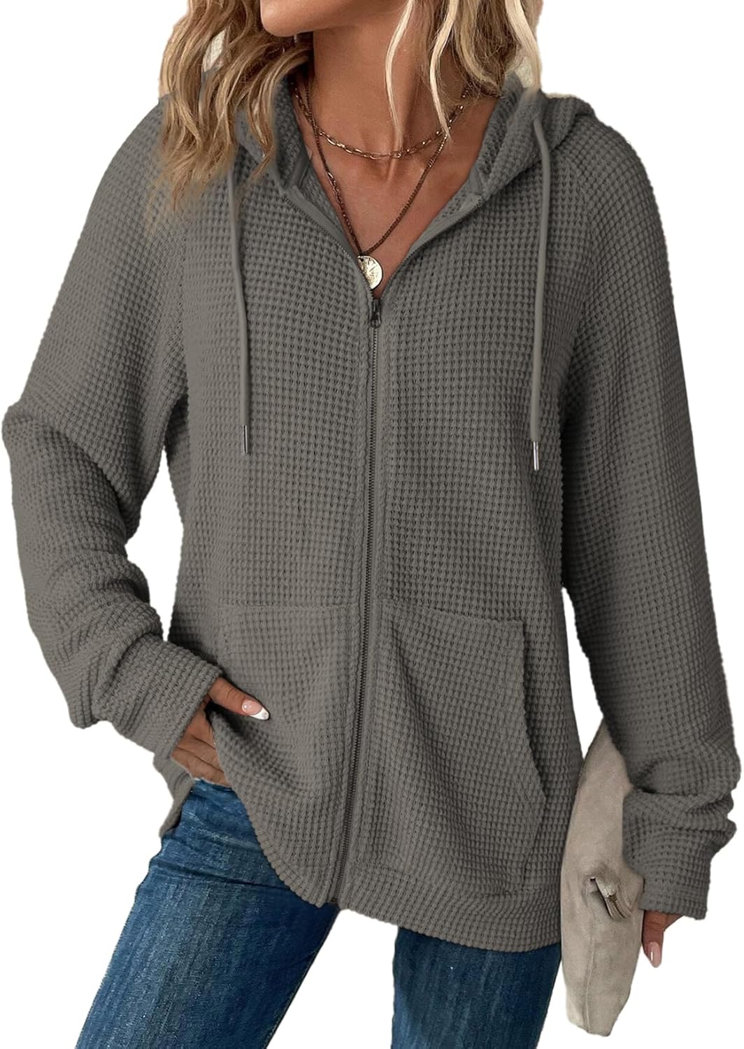 Dokotoo Women’s Full Zip Up Hoodies Waffle Knit Long Sleeve Drawstring Casual Sweatshirt Hooded Tops